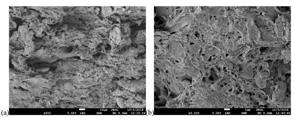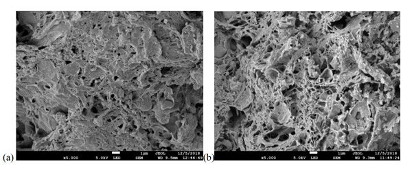 根據(jù)觀察到的活性炭微觀結(jié)構(gòu)來進行形態(tài)研究。圖1顯示了在650°C(a)和850°C(b)兩種不同溫度下用25%H3PO4制成的活性炭的比較。可以看出,與650℃相比,在850℃下制備的活性炭具有稍大的孔?梢缘弥左w積隨著活化溫度的升高而逐漸增加。