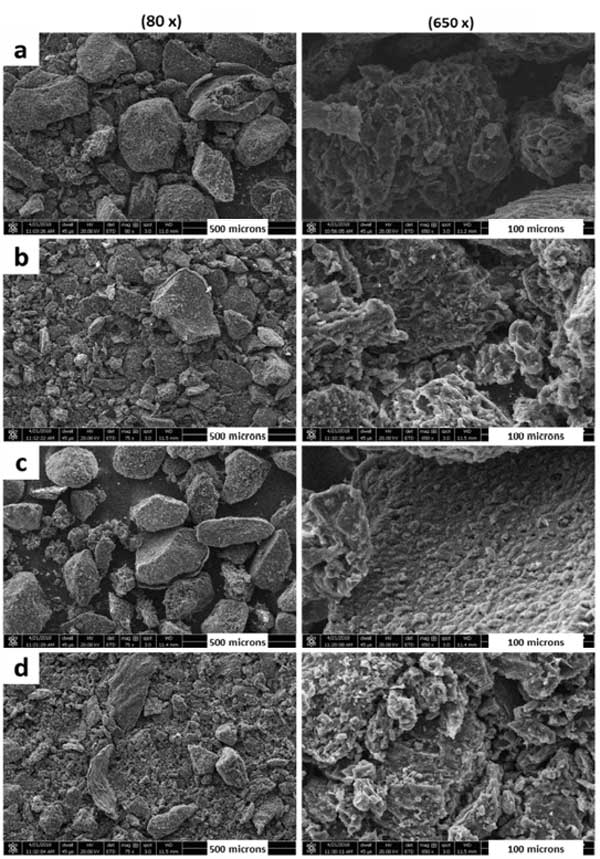我們使用現(xiàn)代分析技術(shù)來了解制備的活性炭催化劑的真實性質(zhì),掃描電子顯微鏡(SEM)是查看材料形態(tài)的強(qiáng)大工具。圖1顯示了四種活性炭樣品的SEM圖像。圖像是在兩個不同的分辨率,以比較不同比例的樣本。評估不同煅燒溫度的影響是很重要的。圖1的左側(cè)圖像顯示,無論煅燒溫度如何,所有樣品的表面都被各種亞微米大小的顆粒所掩蓋,并且表面上存在許多明顯的解理。不同煅燒溫度下的熱解對活性炭樣品的形貌影響不大,但有輕微的變化,如一些顆粒從表面被去除,一些解理被侵蝕。此外,從這些SEM圖像可以推斷,這些活性炭材料中的許多微孔結(jié)構(gòu)使其成為任何化學(xué)反應(yīng)中反應(yīng)物相互作用的極好載體。