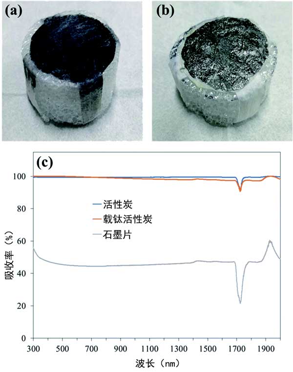 圖1:(a)活性炭/泡沫和(b)石墨/泡沫的圖片。(c)不同光熱層的UV-vis-NIR吸收光譜。