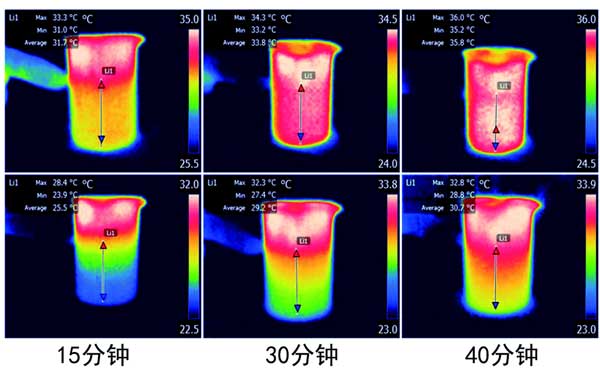 圖3:輻照下的紅外圖像,浸沒的載鈦活性炭(頂部)和載鈦活性炭/泡沫(底部)。