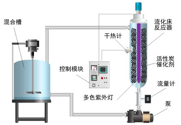 圖1:中試規(guī)模的流化床光反應(yīng)器示意圖,用于從工業(yè)廢水中去除苯胺和苯并噻唑的光催化和吸附實驗。
