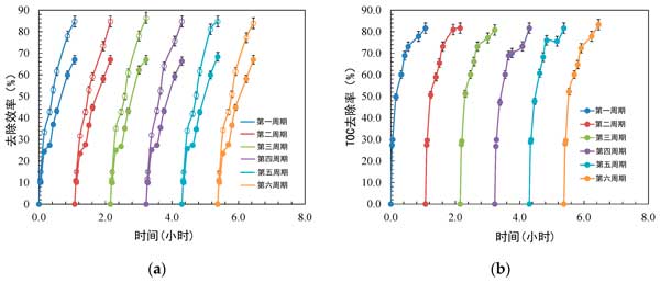 活性炭光催化劑在連續(xù)循環(huán)中持續(xù)保持其對苯胺和苯并噻唑去除的催化活性的能力對其實際應(yīng)用至關(guān)重要。因此,活性炭光催化劑經(jīng)歷了六次使用循環(huán)。如圖4所示,光催化劑在連續(xù)六個1小時反應(yīng)循環(huán)后顯示出相似的催化活性,保持84.7%的苯胺初級降解和67.0%的苯并噻唑初級降解,以及81.6%的礦化。