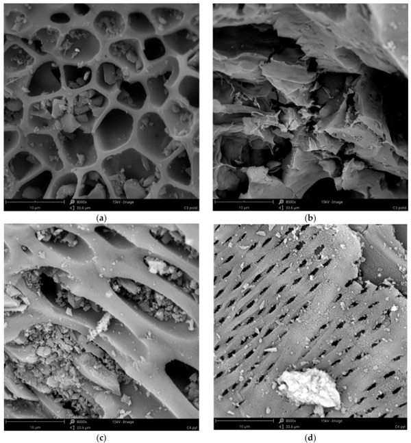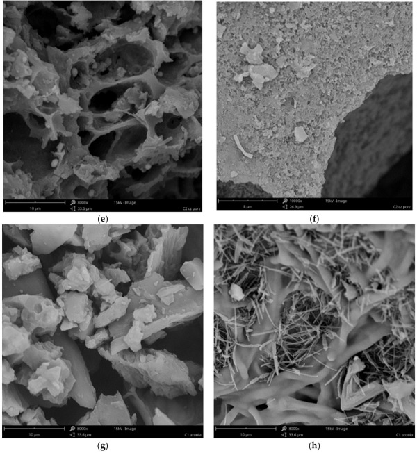 在溶劑加載之前的活性炭通過使用掃描電子顯微鏡作為SEM顯微照片進行表征(圖1)。分析表明,不僅研究不同材質(zhì)活性炭彼此的不同,而且在一種材料中也可能出現(xiàn)不同的結(jié)構(gòu)(圖1a與圖1b、圖1c與圖1d、圖1e與圖1f和圖1g與圖1h)。所有的材料都不是均質(zhì)的,在所有的原材料中,都可以發(fā)現(xiàn)具有不同孔隙率的顆粒、壓實的塊狀,甚至是纖維結(jié)構(gòu)。材料C1(粒徑0.5÷0.75mm的活性炭)是高度多孔的,顆粒充滿可見孔,直徑為5÷11µm,壁光滑(圖1a),顆粒結(jié)構(gòu)的壁密度較低,但也有很大的表面積(圖1b)。粉狀活性炭(C2)具有較小的(圖1d)和較大的(圖1c)孔,具有光滑(圖1c)和較粗糙(圖1d)的壁和細長的形狀。這兩種材料似乎都具有良好的孔隙率和表面,因此它們應(yīng)該是非常有效的吸附劑。我們的結(jié)果證實,C1和C2在鉭的去除方面都非常有效,去除效率約為97%。C3的多孔性要小得多。雖然有一些顆粒具有相對較高的孔隙(圖1e),但也有較高含量的更致密、相當(dāng)無孔的塊狀(圖1f)?紫督Y(jié)構(gòu)受到輕微干擾,可能是由植物材料中可能存在的無機化合物晶體造成的(圖1e)。因此,這種結(jié)構(gòu)表明較低的表面和吸附特性。然而,無孔件的表面積似乎很發(fā)達(圖1f)。這是相當(dāng)虛幻的,因為在使用的所有活性炭中,材料C3的鉭去除效率最低(81%)。最小的大孔材料似乎是C4炭。它由具有緊湊結(jié)構(gòu)的塊(圖1g)和類似于納米管或纖維結(jié)構(gòu)的形式(圖1h)組成。這種材料的多孔性也比C1和C2少,但由于纖維的原因,它的表面應(yīng)該比C3更發(fā)達,因此它應(yīng)該具有更好的吸附效率。事實上,這種材料的鉭去除效率略高于C3,但仍低于活性炭C1和C2。根據(jù)這些結(jié)果,可以得出結(jié)論,C1和C2的原材料就具有大孔結(jié)構(gòu)。