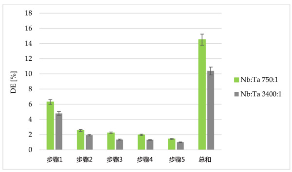 在進一步的研究中,檢查了是否可以多次使用相同部分的浸漬活性炭從鉭中提純鈮。為此,以分批模式進行解吸研究。使用了兩種不同的剝離劑草酸銨和過氧化氫的溶液(圖3),它們與鉭離子形成穩(wěn)定的絡(luò)合物。解吸過程分五個步驟進行,在使用4%草酸銨溶液而不是15%過氧化氫溶液的情況下,解吸效率明顯更高。使用第一汽提劑,可以回收保留在活性炭上約50%的鉭。大部分鉭在第一步和第二步中回收,因此在第五步停止解吸,認識到繼續(xù)該過程不會顯著提高所獲得的解吸百分比。解吸效率還受吸附過程中活性炭上保留的鉭量的影響。在批量吸附過程中保留在樹脂上的鉭量的差異是由于使用了具有不同鈮與鉭比率的溶液,同時保持溶液中Nb和Ta離子的可比總濃度。降低活性炭(Nb:Ta=3400:1)上的鉭量會導(dǎo)致解吸效率顯著降低,這可能是由于活性炭結(jié)合了一些鉭離子。