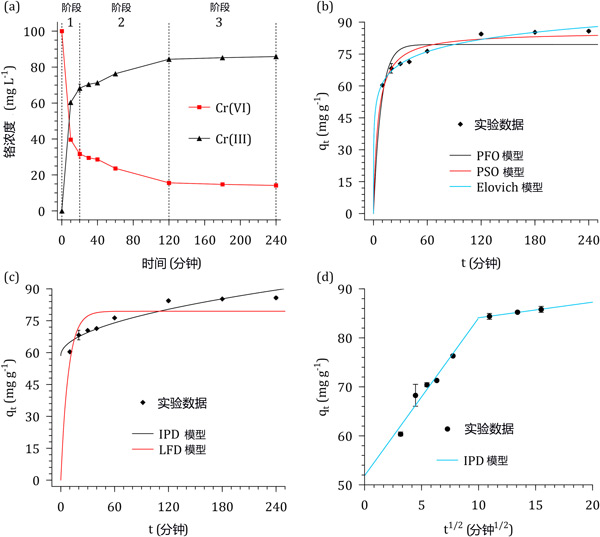 圖2:(a)六價(jià)鉻溶液和浸漬活性炭接觸時(shí)間對(duì)Cr濃度和形態(tài)的影響。(b)反應(yīng)動(dòng)力學(xué)模型、(c)擴(kuò)散模型和(d)線性化的顆粒內(nèi)擴(kuò)散模型。