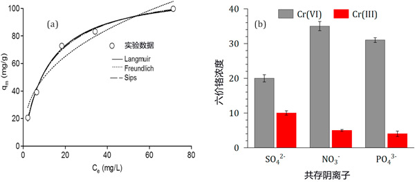 圖3:(a)浸漬活性炭吸附六價(jià)鉻的平衡等溫線,(b)競(jìng)爭(zhēng)陰離子對(duì)平衡鉻濃度的影響。