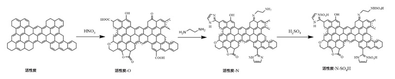以活性炭為原料,用HNO3氧化,用乙二胺胺化。得到的中間體用硫酸水溶液處理以產(chǎn)生硫酸氫活性炭催化劑。通過過濾分離產(chǎn)物并在105℃干燥24小時;钚蕴康木唧w制備方案如圖1所示。