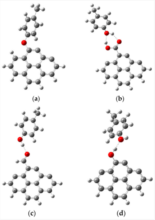 預計甲酚在活性炭上的吸附將通過各種類型的相互作用進行,例如電子供體-受體機制、靜電相互作用、π-π相互作用和氫鍵形成。然而,在各種類型的相互作用中,活性炭和被吸附物之間的氫鍵是有助于吸附過程的重要相互作用類型之一。因此,在本研究中,使用DFT方法研究了對甲酚和活性炭之間的氫鍵相互作用?紤]到它們之間的氫鍵,研究了對甲酚與原始活性炭和功能化活性炭的相互作用。圖1代表各種相互作用的優(yōu)化結構。