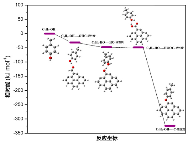 圖2:甲酚吸附到原始和功能化活性炭上的相對能量圖。