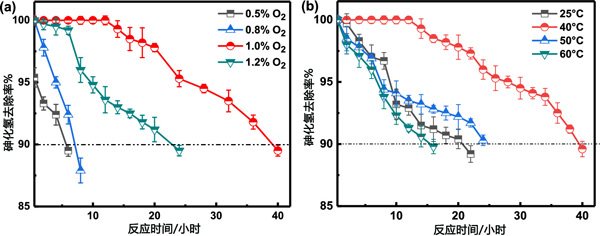 圖2:氧含量(a)和反應(yīng)溫度(b)對AsH3去除效率的影響。