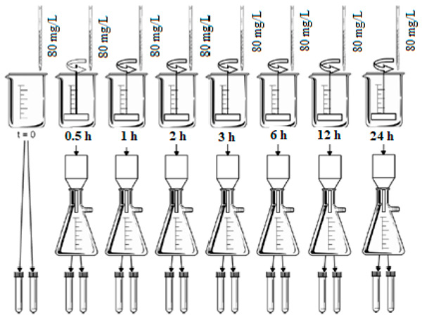 測(cè)定平衡時(shí)間的吸附試驗(yàn)對(duì)每種活性炭進(jìn)行兩次。使用了7個(gè)裝有500mL研究水的1L燒杯。每個(gè)燒杯接受一份活性炭懸浮液,以在水研究中獲得80mg/L的初始濃度。將燒杯放在一個(gè)罐子測(cè)試設(shè)備中,將混合速度保持在205rpm在恒溫23℃的環(huán)境中。采用的接觸時(shí)間為0.5、1、2、3、6、12和24小時(shí)。接觸時(shí)間后,將每個(gè)燒杯從攪拌中取出,立即通過(guò)孔徑為0.22μm的纖維素酯膜過(guò)濾研究水,以分離碳并中斷吸附過(guò)程。分析過(guò)濾后的水餾分的pH值和柱狀藻紅濃度。圖1顯示了平衡時(shí)間測(cè)定分析中評(píng)估的條件的示意圖。