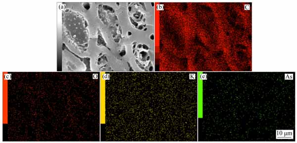 圖3:活性炭電極As(V)電吸附后的SEM像(a)和元素分布(b-e)。