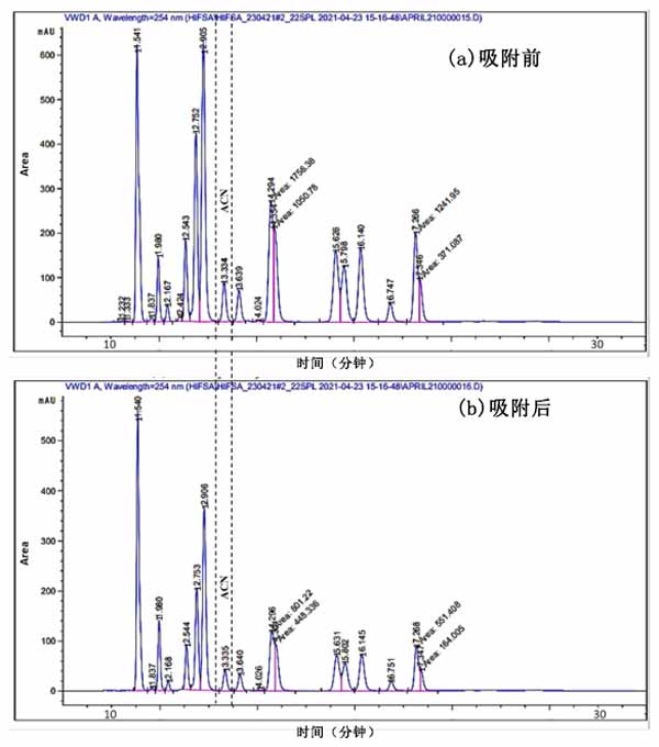 圖1:廢水(a)吸附前和(b)吸附后的HPLC分析。