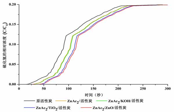 通過選擇合成吸附劑對硫化氫氣體的吸附效果產(chǎn)生了如圖3所示的吸附曲線。這些吸附曲線也與使用浸漬活性炭和原活性炭實現(xiàn)的吸附進行了比較。我們發(fā)現(xiàn)吸附趨勢呈指數(shù)增長,形成S曲線。突破時間被確定為硫化氫濃度達到1ppm(突破濃度)和飽和濃度達到幾乎5000ppm的值所用的時間。與其他雙金屬活性炭吸附劑相比,ZnAc2/ZnO/活性炭吸附劑的吸附表現(xiàn)出優(yōu)異的性能。雙金屬活性炭吸附劑的合成表現(xiàn)出良好的性能,與ZnAc2/活性炭和原活性炭相比,硫化氫的吸附增加了30.2-45.8%和85.9-89.1%。因此,采用這種浸漬方法的活性炭表現(xiàn)出的高吸附增強了硫化氫吸附能力。