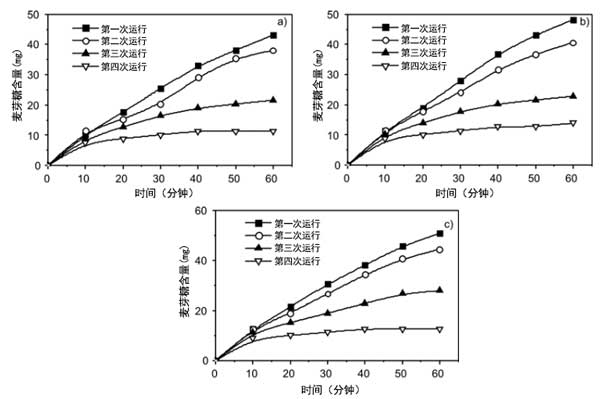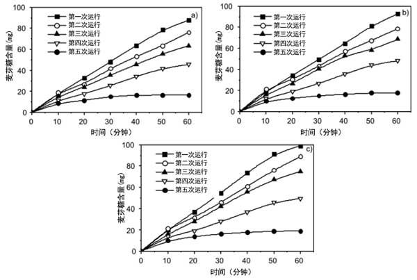 在間歇反應(yīng)器中檢測(cè)游離酶和固定化酶的水解活性。通過(guò)將可溶性淀粉溶解在蒸餾水中制備%淀粉溶液,并通過(guò)0.1M/HCl將pH值調(diào)節(jié)至4.7。然后將1g含有α-淀粉酶的活性炭纖維置于測(cè)試小瓶中。隨后,加入100cm3的淀粉溶液,并將系統(tǒng)在40℃下不斷搖動(dòng)的水浴中孵育。每10分鐘抽取1cm3溶液以確定水解麥芽糖的量。通過(guò)加入1cm3的3,5-二硝基水楊酸試劑終止反應(yīng)。還在沸水浴中孵育5分鐘。還原糖(麥芽糖)的量通過(guò)分光光度法在540nm處測(cè)定。