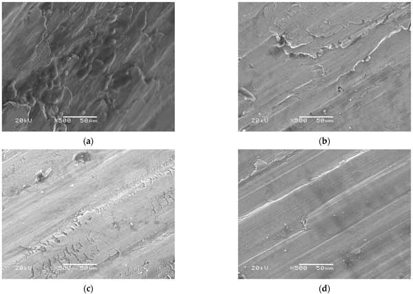 通過觀察摩擦學測試的結(jié)果,很明顯平均磨痕直徑和質(zhì)量損失的減少結(jié)果具有相似的趨勢。然而,當將活性炭添加到潤滑脂中時,質(zhì)量損失值顯示出更陡峭的趨勢。為了進一步了解質(zhì)量損失結(jié)果以及表面的磨痕形貌,應用了與能量色散X射線(EDX)系統(tǒng)集成的SEM。測試氣缸磨痕的EDX光譜是針對放大500倍的SEM圖像確定的,以便從磨痕的表面軌跡中獲得關于接觸表面上的摩擦膜的沉淀元素(碳和氧)的必要信息。圖3顯示了以500倍放大倍率成像時的磨損表面形態(tài)。在具有粗糙表面形態(tài)的商業(yè)油脂樣品的情況下,圖像描繪了淺槽和深槽(圖3a)。另一方面,活性炭樣品和2wt.%其他樣品的磨損表面(圖3b,c)顯示出淺槽,帶有少量深槽點和光滑的形貌,而在0.5wt.%活性炭+2wt.%其他樣品的混合樣品僅顯示出薄槽(圖3d)。