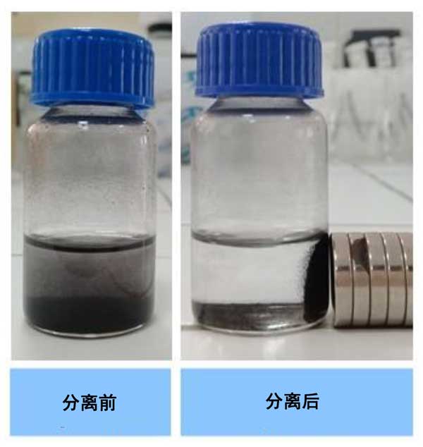 圖3:Cu-Fe3O4-活性炭催化劑在外部磁場下的磁分離。