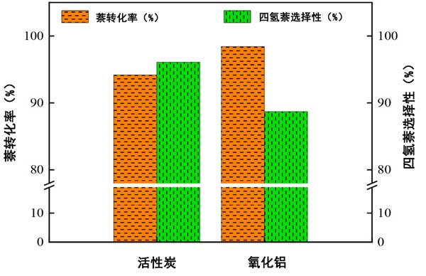圖3:活性炭和氧化鋁催化劑的萘轉(zhuǎn)化率和四氫化萘選擇性。
