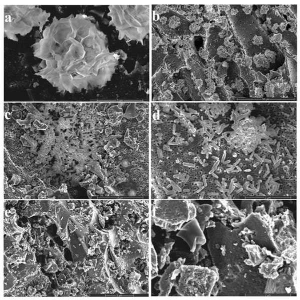 改性活性炭和活性炭樣品的微觀結構通過SEM表征。如圖2所示,改性活性炭樣品在活性炭表面生長有花狀Bi2O2CO3,大小約為。5μm(圖2a、b)。這些結果表明Bi2O2CO3通過原位結晶過程在活性炭表面成功生長;钚蕴烤哂袌A柱狀形態(tài),長度為數(shù)百納米(圖2c、d)。圖2e、f顯示了原始活性炭樣品的形態(tài),它具有多孔結構、高比表面積和良好的吸附能力。