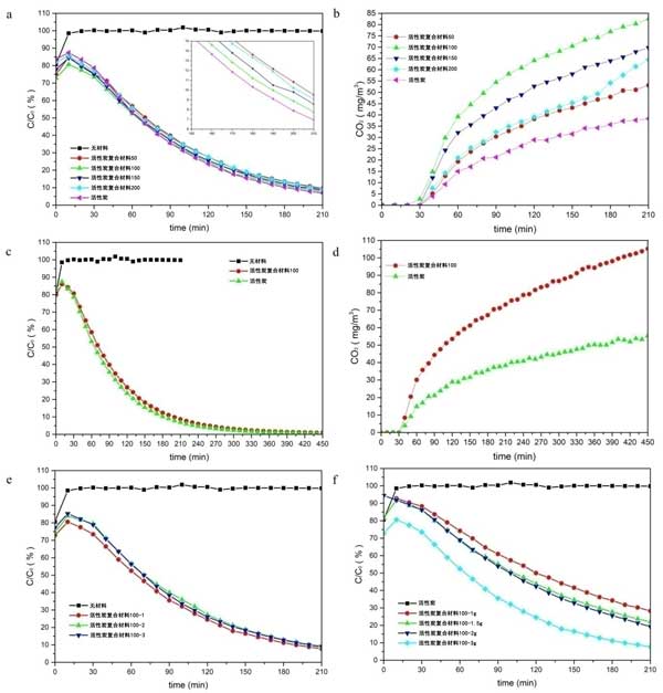 圖3:活性炭樣品去除空氣中甲苯的光催化性能(a)樣品的CO2產(chǎn)率(b)活性炭復合材料和活性炭去除甲苯的性能(c)CO2產(chǎn)率(d)三個循環(huán)的穩(wěn)定性(e)不同用量活性炭復合材料的甲苯去除效率(f)。