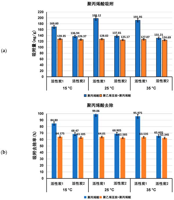 圖1:聚丙烯酸吸附量(a)及其從活性炭表面去除的百分比(b)在單一和混合吸附物系統(tǒng)中,在三個(gè)檢測溫度pH值3下。