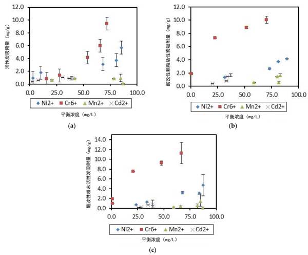 圖2:金屬離子在不同吸附劑上的吸附等溫線(a)活性炭,(b)酸處理顆;钚蕴浚(c)酸處理粉末活性炭。