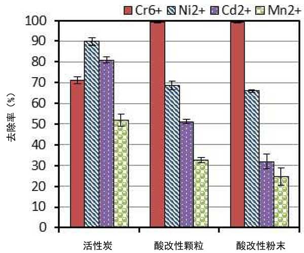 顆粒活性炭的酸處理與未處理的活性炭相比,Cr6+去除效率提高了30%,而Ni2+、Mn2+和Cd2+分別降低了23%、36%和37%。這可以通過與其他離子相比更高的離子勢和Cr6+的小尺寸來解釋。這將導(dǎo)致Cr6+對酸性表面基團(tuán)的吸引力更強(qiáng),并更快地?cái)U(kuò)散到活性炭的孔隙中。高正電的Cr6+離子會吸附在孔隙邊緣的酸性功能位點(diǎn)上,排斥其他較弱的重金屬離子,降低它們對活性炭孔隙的可及性。