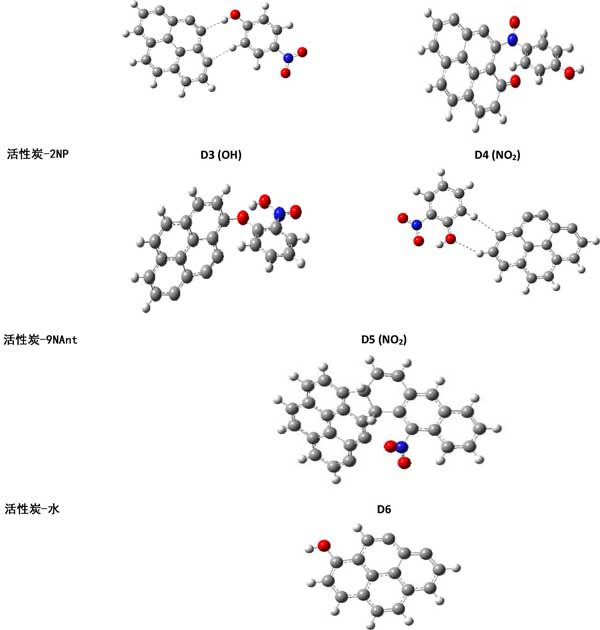 圖1:污染物和水與活性炭連接形成兩個分子聚集體的優(yōu)化結(jié)構。