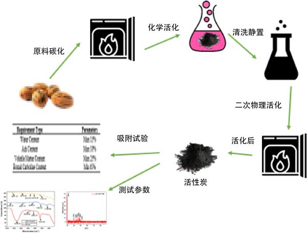 果殼用作生產(chǎn)活性炭的原料。在果殼廢料的合成過(guò)程中,第一步是將殼在陽(yáng)光下干燥3小時(shí)。然后將干燥的果殼在350℃的溫度下碳化2小時(shí)。隨后使用研缽將碳化的果殼研磨成粉末,然后過(guò)100目篩。樣品制備首先稱(chēng)量肉豆蔻殼粉末和預(yù)定的1M-HCl溶液。接下來(lái),用1M-HCl溶液將粉末活化24小時(shí);罨,活性炭過(guò)濾并用蒸餾水洗滌,直至pH值變?yōu)橹行。一旦pH值為中性,活性炭就會(huì)在110℃的溫度下煅燒1小時(shí)。煅燒后,來(lái)自肉豆蔻殼的碳在惰性氣體氣氛(氮?dú)?中在600℃、650℃和700℃的溫度下退火2小時(shí)。然后用蒸餾水洗滌所得結(jié)果以除去金屬化合物。氨(NH3)水平降低最多的樣品將根據(jù)下面的圖1進(jìn)行表征。