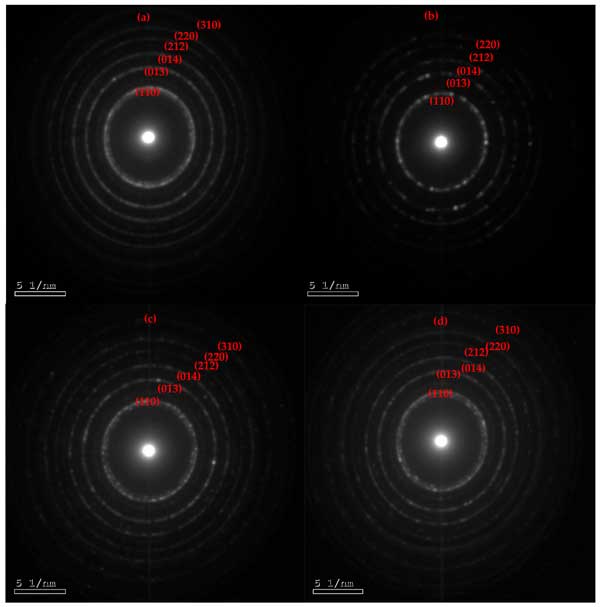 圖2:通過(guò)電子衍射HRTEM獲得的合成(a)BiOI、(b)1C/BiOI、(c)5C/BiOI和(d)10C/BiOI納米復(fù)合材料的SAED圖像。
