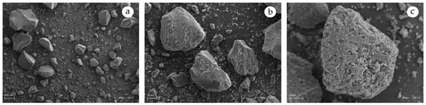 圖1:不同放大倍數(shù)下的活性炭SEM圖像:(a)100×,(b)500×,(c)1400×。