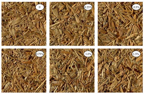 在UF樹脂中添加活性炭還可以改善刨花板的各種機械性能。研究表明,活性炭可以提高板材的尺寸穩(wěn)定性、強度和防水性。這在擔心潮濕暴露的應(yīng)用中尤其有益。所生產(chǎn)的刨花板的外觀如圖2所示。添加高達1.5%活性炭沒有觀察到任何影響。相反,在碳含量較高的情況下,所得板材變暗并變灰。因此,在不影響材料美觀的情況下,這可以被視為較小負載的優(yōu)勢。