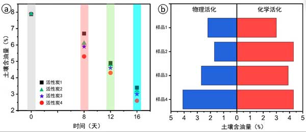 實驗開始時,指定了兩個地塊:第一個地塊作為受石油污染土壤的對照,而第二個地塊用于測試活性炭樣品以進(jìn)行修復(fù)。每個地塊面積為4平方米(2.0米×2.0米),每個地塊約有50公斤土壤。通過在空氣中兩階段熱解,用氫氧化鉀活化生物質(zhì)植物殘渣產(chǎn)生的活性炭被引入受石油污染的土壤中。施用活性炭后,土壤被適當(dāng)潤濕并通氣。處理后8至16天內(nèi)定期收集土壤樣本以評估含油量。土壤樣本中的含油量采用重量法測定,包括在索氏提取器中使用熱己烷從土壤樣本中提取碳?xì)浠衔铩?/p>