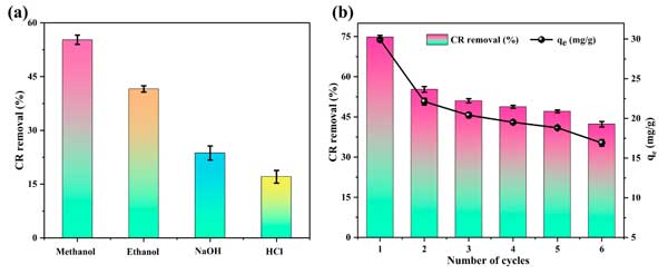 在圖4a中描述的解吸實(shí)驗(yàn)證明了溶劑類型對從支出的活性炭中去除CR的顯著影響。溶劑按降低的解吸效率順序?yàn)榧状?乙醇>NaOH>HCl,其去除效率分別為55.28%,41.56%,23.66%和17.06%。與乙醇相比,甲醇的出色性能是由于其較低的分子量和較短的烴鏈。這些特性可能有助于更有效地滲透到活性炭的孔中,從而破壞CR-活性炭相互作用。此外,其較高的極性大概有助于破壞非共價(jià)相互作用,例如氫鍵或范德華力。相反,對NaOH和HCl觀察到的較低的解吸效率表明,強(qiáng)堿或酸不容易逆轉(zhuǎn)CR-活性炭的吸附。這可能是由于較大離子物種的孔穿透有限,可能受到空間效應(yīng)或擴(kuò)散屏障的阻礙,或者是由于與Cr反應(yīng)后保留在孔中保留的不溶性沉淀物的形成。因此,選擇甲醇作為再生研究的解劑溶劑。