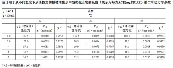 使用不同濃度的活性炭(1、2、4、6和8g / 100mL)和溫度(10,25和45℃)進行批次吸附試驗,用于從橄欖磨廢水中除去酚類化合物。在最佳條件下(8g活性炭/ 100mL),活性炭的最大吸附容量在10℃為35.8mg / g,25℃為35.4mg / g,在40℃為36.1mg / g。通過Langmuir等溫線在三個不同的溫度下令人滿意地擬合了總多酚吸附的平衡數(shù)據(jù)。偽二階模型(R 2 > 0.9204)與偽一階模型(R 2<0.8750)相比更好地解釋了吸附動力學。該研究的結果表明,活性炭可以有效地用作從橄欖油工業(yè)廢水中去除酚類化合物的吸附劑。預處理廢水作為生物乙醇生產(chǎn)的清潔底物具有潛力,并在環(huán)境和經(jīng)濟方面得到額外的好處。此外,吸附的酚類化合物可以在食品,化妝品工業(yè)中回收和純化后使用。
