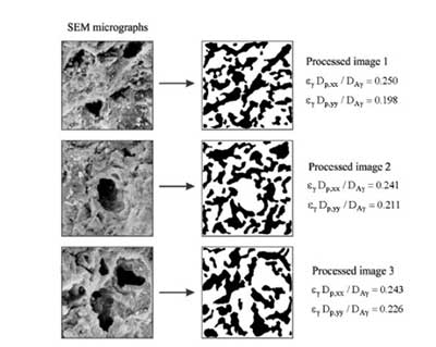 通過(guò)掃描電子顯微鏡使用2400倍放大倍數(shù)檢查活性炭的形態(tài)。使用圖像處理工具箱處理圖像。程序如下。首先,通過(guò)將灰度轉(zhuǎn)換為灰度(從0(黑色)到255(白色)]來(lái)改善黑暗和光照區(qū)域之間的對(duì)比度。由于深色區(qū)域在視覺(jué)上指示深刻,所以假設(shè)這些代表孔隙占據(jù)的部分,而淺色區(qū)域與固體基質(zhì)(活性炭)有關(guān)。這個(gè)想法一點(diǎn),每個(gè)象素的灰度值被跟蹤(來(lái)自黑色),并累積,得到體積分?jǐn)?shù) ε γ 的較暗的像素。其次,具有等于或小于閾值的值的所有像素被轉(zhuǎn)換成白色(被孔占據(jù)的空間),而具有較高值的像素被轉(zhuǎn)換成黑色(實(shí)心矩陣)。最后,為了增強(qiáng)輪廓的定義,應(yīng)用濾波器。這個(gè)程序允許我們獲得最終的二值圖像,其中白色和總像素?cái)?shù)之間的比率等于活性炭的孔隙率。事實(shí)上,來(lái)自SEM顯微照片的處理圖像提供了解決閉合問(wèn)題的領(lǐng)域。