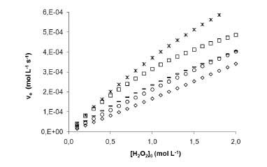 在圖2中被視為在活性炭的質(zhì)量發(fā)生改變比初始反應(yīng)速率時過氧化物的初始濃度是,(a)中1,60x10 -1 mol L-1和( b)在298K的溫度下為7.92×10 -2 mol L -1。相對于活性炭的質(zhì)量-體積獲得反應(yīng)順序是一個和表觀速率常數(shù),ķ VEL,是約0.11毫升克-1小號-1在298 K(0.12毫升克-1 小號-1時[H 2 ö 2 ] 0 = 1,60x10 -1 mol-1和0.10毫升克-1小號-1時[H 2 ö 2 ] 0 = 7,92x10 -2molL -1)。