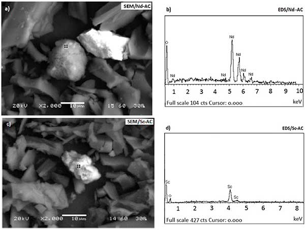 圖2、2000×時的SEM顯微照片和分別在Nd(a,b)和Sc(c,d)吸附后的活性炭的相應(yīng)EDS光譜。