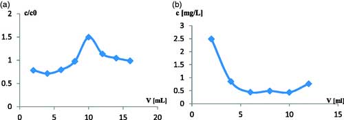 圖2.(a)氧化活性炭上銨離子(NH4+)的SPE(c/c0=f(V))過(guò)程中的穿透曲線。(mcar=0.104g ,離子濃度c=NH4+- = 0.661mg/L)。指定每5ml濾液的比例c/c0。(b)經(jīng)過(guò)SPE柱分析每2ml洗脫液后,來(lái)自經(jīng)氧化的活性炭的銨離子解吸曲線(c= f(V))。
