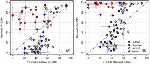 圖2.比較在(A)等效質(zhì)量基礎和(B)等效表面積基礎上進行的批量實驗測量的每種微污染物與P-CDP或活性炭接觸5分鐘后的百分比去除率。每個面板中的誤差線代表五次測量的標準偏差。顏色表示在進行實驗的pH(pH = 7)下微污染物的電荷狀態(tài)。