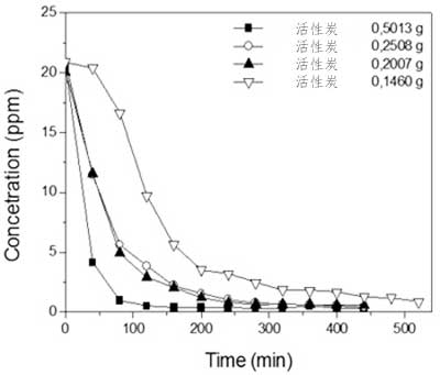 使用不同的質(zhì)量對活性炭的4-硝基酚吸附容量清楚地表明,在較低的質(zhì)量下,以mg g-1表示的吸附容量較高,盡管這是在較高的飽和時間獲得的。這偏離了預(yù)期,因為吸附容量應(yīng)該標(biāo)準(zhǔn)化為每克吸附劑,因此應(yīng)當(dāng)獨立于所使用的吸附劑質(zhì)量。這個意想不到的結(jié)果主要是由于擴散問題,例如搖動,意味著當(dāng)降低間歇系統(tǒng)中的擴散阻力時獲得更高的效率,導(dǎo)致4-硝基酚溶液更均勻的分布,同時溶液之間質(zhì)量增加的接觸減少和吸附劑。