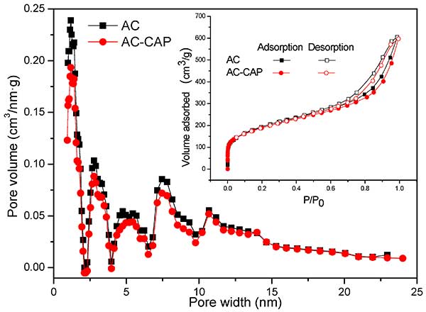 圖1.在氯霉素吸附之前活性炭的分子量 和N 2吸附/解吸等溫線(插入)和氯霉素吸附之后的活性炭?讖椒植加擅芏确汉碚(DFT)方法確定。