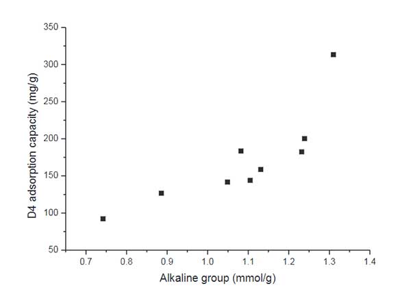 圖2.堿性基團濃度與堿性活性炭的硅氧烷吸附容量之間的關(guān)系。