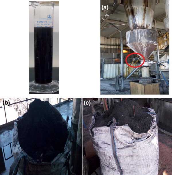 圖1:糖汁深色液體,旋風(fēng)分離器球閥活性炭收集器(a),活性炭(b,c)。