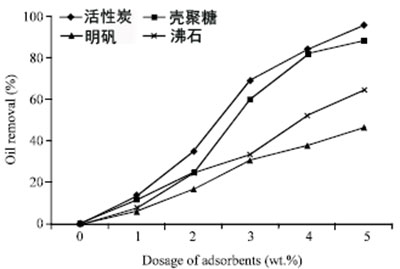 通過改變吸附劑的重量,以100rpm的混合速率,1小時,分析不同吸附劑用量(wt。%)對活性炭與沸石相比對MEA去除殘留油的影響;旌蠒r間,在25-30℃的溫度下接觸時間為1小時。測試在樣品的原始pH下進(jìn)行,即11.21。在CO 2去除單元系統(tǒng)中根據(jù)需要維持pH水平。圖1顯示了使用活性炭和沸石從MEA廢水中去除殘留油的百分比。從圖1中可以看出觀察到,在最高吸附劑用量(5重量%)下,活性炭與其他物質(zhì)相比顯示出最高的殘油去除率;钚蕴砍晒Τ87%的殘油,沸石為46%?梢缘贸鼋Y(jié)論,活性炭最好比其他吸附劑更好地除去殘油。