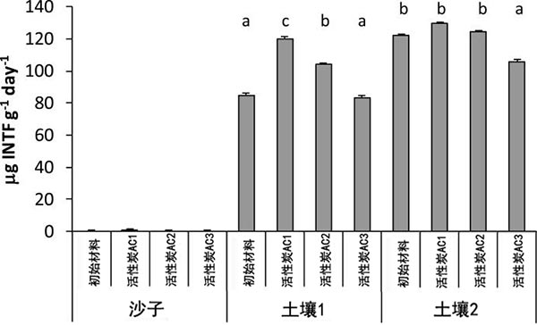圖2:在具有不同活性炭修復的沙子和土壤中的脫氫酶活性。