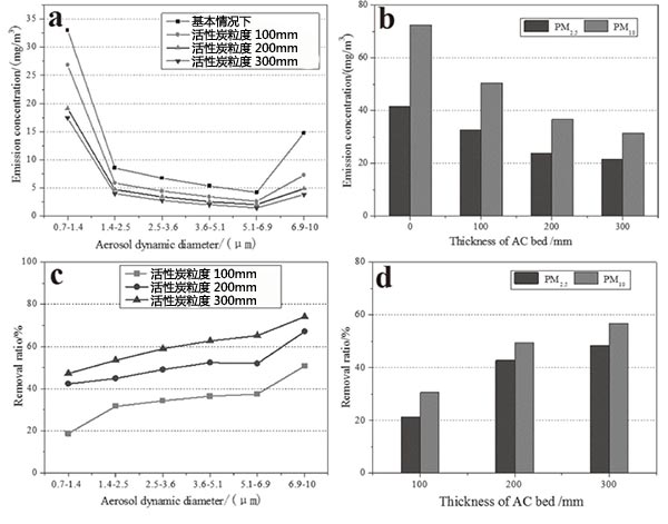 (1)活性炭去除PM 10比去除PM 2.5更有效,并且增加活性炭的吸附厚度或減小活性炭粒度有助于去除超細顆粒。除去率到PM 10和PM 2.5達到67.3%,并且當(dāng)活性炭厚度和顆粒尺寸分別為200mm至3-5毫米,吸附效果能達到58.7%。