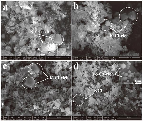 圖4顯示了煙氣通過活性炭之前和之后的化學(xué)組成。可以發(fā)現(xiàn)PM 2.5中的+ Fe,Ca,Si,Al和Mg的含量在煙氣通過活性床時比基礎(chǔ)情況下都有所增加,而K,Na,Pb的含量, PM 2.5中的 Zn和Cl都出現(xiàn)了下降。圖5給出了煙氣經(jīng)過活性炭層后在過濾器中收集的PM 2.5的SEM圖像,觀察到經(jīng)活性炭去除后,較大顆粒的數(shù)量主要由K和Cl組成減少(圖5)(b)-5(d))與基本情況比較(圖5(a))雖然有許多較小的顆粒,如球形顆粒(圖5(d)),主要包含F(xiàn)e和Ca這種現(xiàn)象與PM 2.5的化學(xué)成分變化非常一致。此外,與使用厚度為200毫米,粒度為8-12毫米的活性炭床的情況相比(圖5(b)),出現(xiàn)了較少的大的富含K-Cl的顆粒,并且出現(xiàn)了許多較小的球形富含F(xiàn)e-Ca的顆粒。