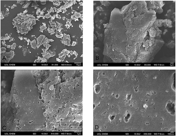 圖1:活性炭在不同放大倍數(shù)上的SEM圖像。