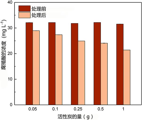 圖3顯示了不同劑量的活性炭處理之前和之后的H​​A濃度。通過在活性炭上吸附適度除去HA。隨著活性炭劑量的增加,HA的去除百分比范圍為9.8%至32%。雖然處理前HA的初始濃度(C 0=30 mg L-1)遠高于聚乙醛(C 0=1 mg L-1),但高劑量的活性炭(例如1g)在2小時內(nèi)也只能去除32%的HA。